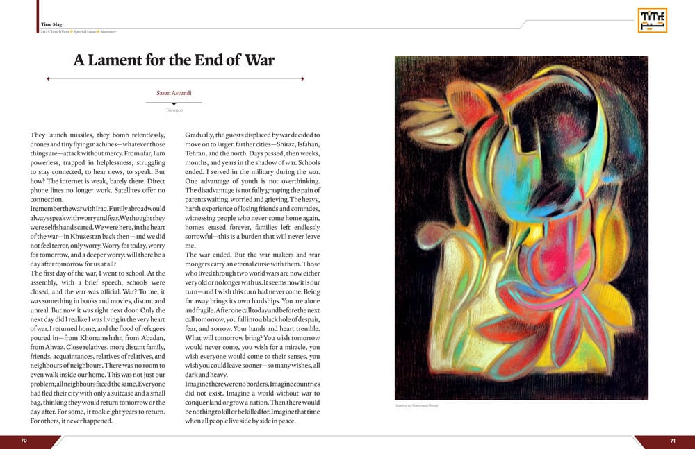 Sasan Asvandi -Toronto |They launch missiles, they bomb relentlessly, drones and tiny flying machines—whatever those things are—attack without mercy. From afar, I am powerless, trapped in helplessness, struggling to stay connected, to hear news, to speak. But how? The internet is weak, barely there. Direct phone lines no longer work. Satellites offer no connection.