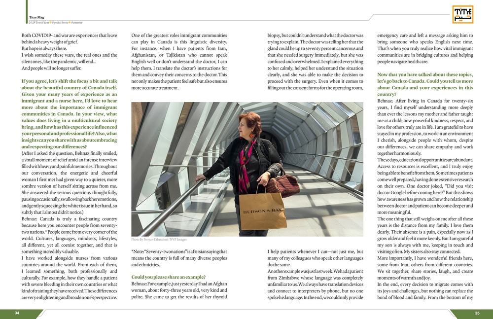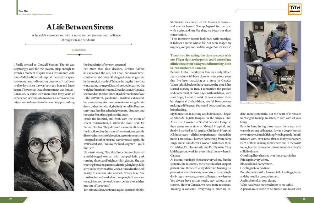 For more than four decades, Behnaz Rahbar has answered the call, not once, but across time, continents, and crises. She began her nursing career in the surgical wards of Tehran during the Iran-Iraq war, treating young soldiers whose bodies carried the weight of a nation’s trauma. Decades later, in Canada, she stood on the frontlines of a different kind of war —the COVID-19 pandemic— masked, exhausted, but unwavering. And now, as missiles once again rain down on her homeland, she finds herself in Toronto, carrying a familiar ache: helplessness, distance, and the quiet fear of losing those she loves.