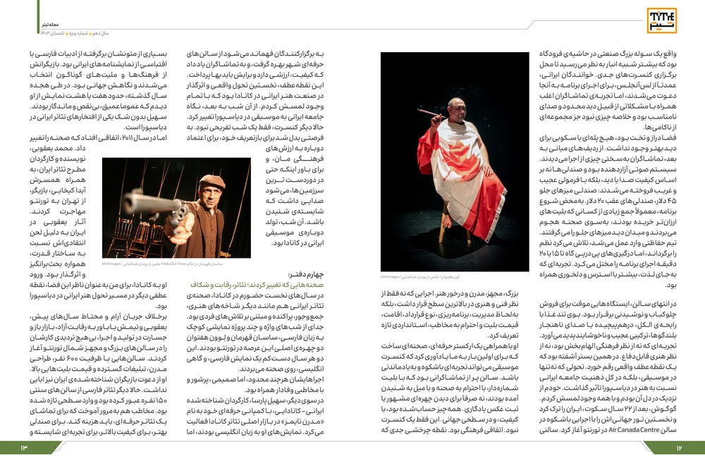 از یک سو، این حرفهایسازی اجراها، ساختارشکنی در قالبها و ارتقاء کیفیت نمایشها، اتفاقی مثبت و ضروری بود. اما از سوی دیگر، روح همکاری و همدلی که سالها در جامعه هنری ایرانیان در کانادا حاکم بود را آرامآرام تضعیف کرد. فضایی که زمانی بر پایه رفاقت و همراهی شکل گرفته بود، حالا جایش را به رقابت، حسادت، و حتی طمع داده بود.