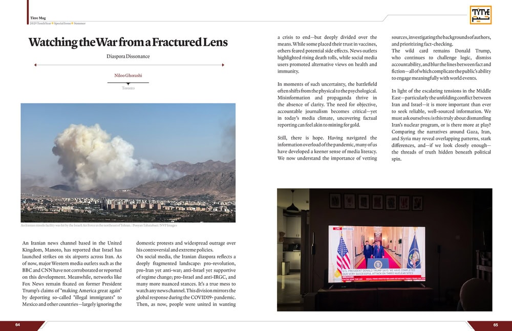 On social media, the Iranian diaspora reflects a deeply fragmented landscape: pro-revolution, pro-Iran yet anti-war; anti-Israel yet supportive of regime change; pro-Israel and anti-IRGC, and many more nuanced stances. It’s a true mess to watch any news channel. This division mirrors the global response during the COVID-19 pandemic. Then, as now, people were united in wanting a crisis to end—but deeply divided over the means. While some placed their trust in vaccines, others feared potential side effects. News outlets highlighted rising death tolls, while social media users promoted alternative views on health and immunity.