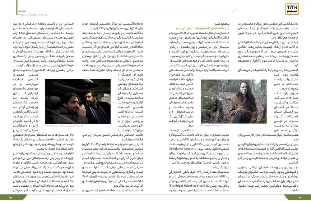 سه سال بعد، در سال ۲۰۱۱، فرهاد آهی، که بهتازگی به کانادا آمده بود و طراحی صحنه فیلم قبلی را نیز بر عهده داشت، نخستین فیلم مستقل کانادایی خود را با نام نیمه روشن ماه (The Bright Side of the Moon) ساخت. فیلم نخست به زبان فارسی بود و فیلم دوم به زبان انگلیسی. این دو اثر، نخستین گامهای جدی برای شکلگیری سینمای ایرانی در کانادا بودند.