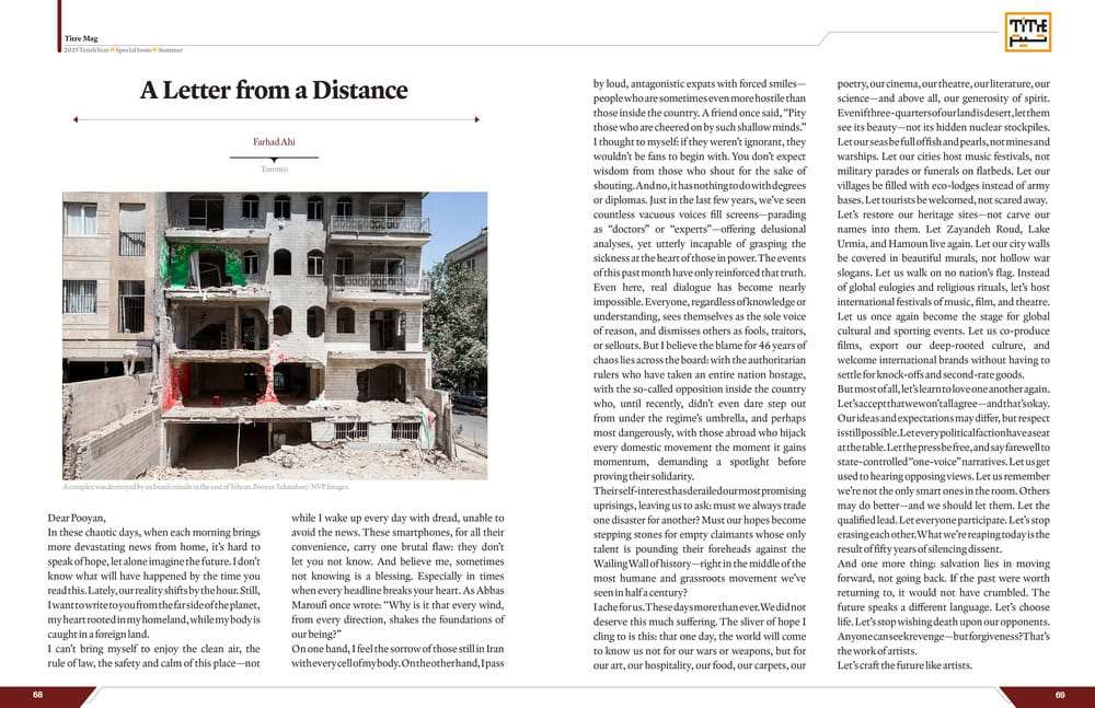 I ache for us. These days more than ever. We did not deserve this much suffering. The sliver of hope I cling to is this: that one day, the world will come to know us not for our wars or weapons, but for our art, our hospitality, our food, our carpets, our poetry, our cinema, our theatre, our literature, our science—and above all, our generosity of spirit. Even if three-quarters of our land is desert, let them see its beauty—not its hidden nuclear stockpiles. Let our seas be full of fish and pearls, not mines and warships. Let our cities host music festivals, not military parades or funerals on flatbeds. Let our villages be filled with eco-lodges instead of army bases. Let tourists be welcomed, not scared away.
